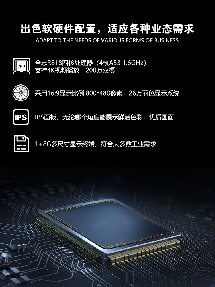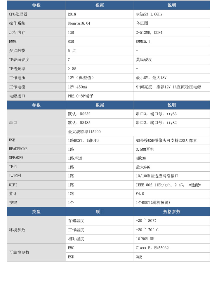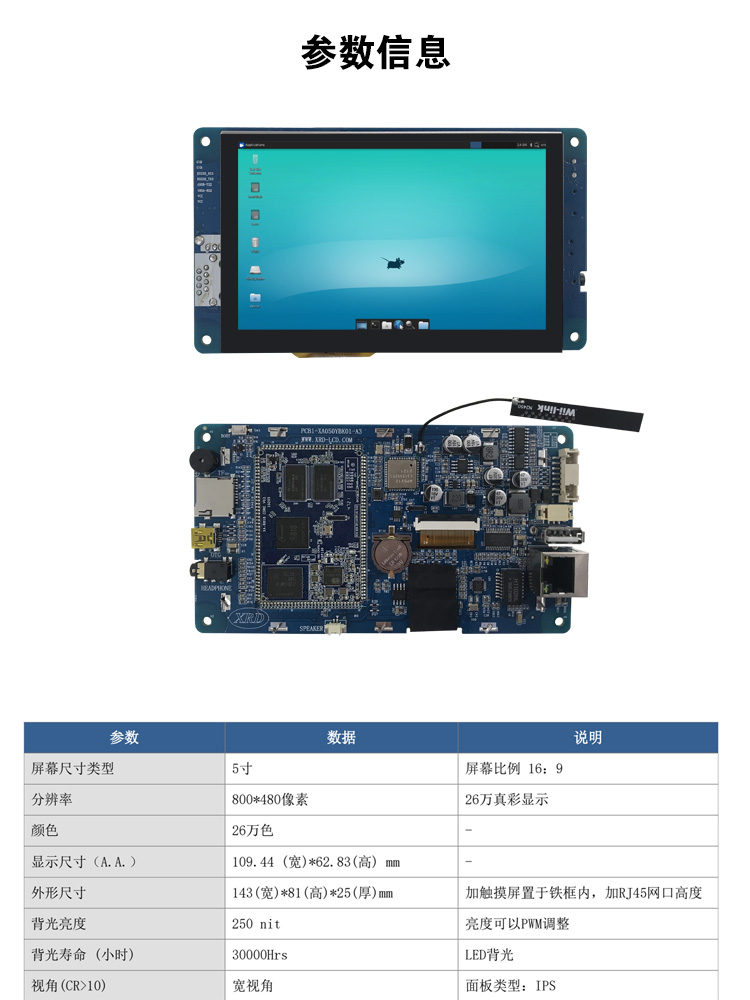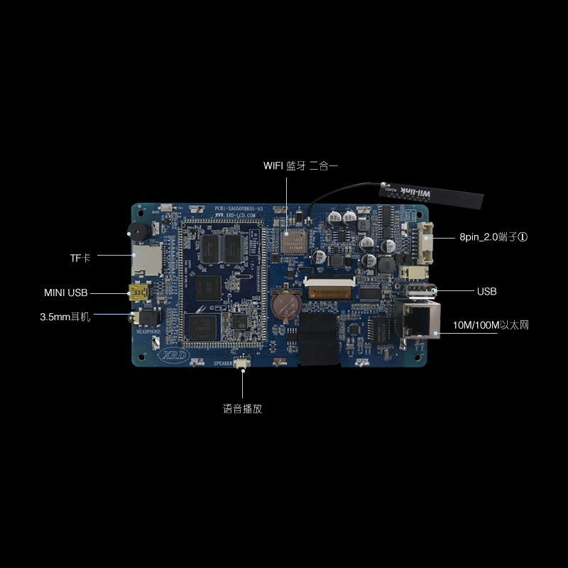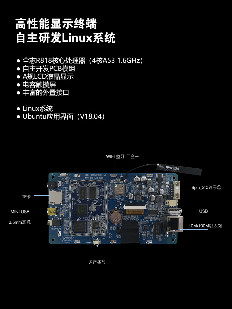 特点描述:XN050YRI01W系列,是j9国际备用基于ARM A53架构自主研发设计的一款工业安卓智能触控显示终端,由底板、LCD显示屏及触摸屏组成。搭载全志R818四核处理器,Ubuntu18.04操作系统,支持自主设计程序安装;全新丽色显示系统,支持自主调节冷暖色调;支持4K视频播放,支持1080P视频通话、200万双摄;接口资源丰富,用户可通过 RS232、RS485、CAN等串口端口与外部设备进行通信;也可以通过WIFI/4G/以太网联网、浏览网页、播放音乐、播放视频、远程升级更新等。