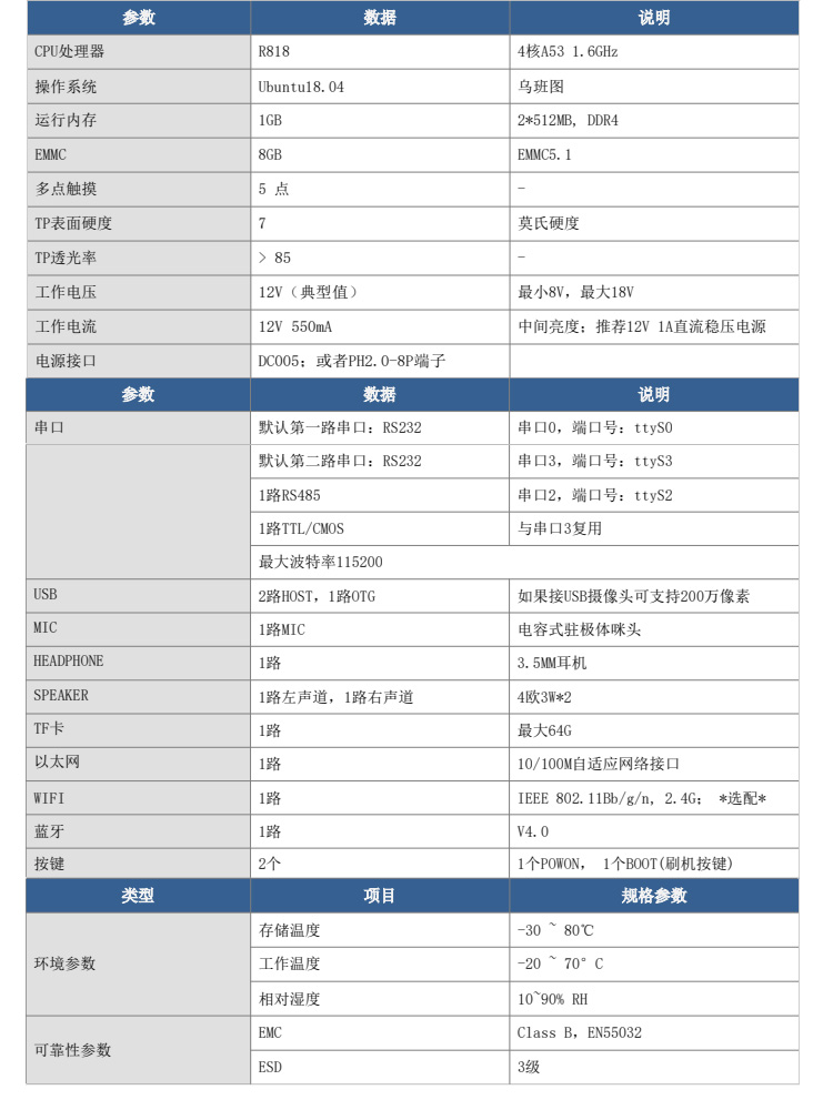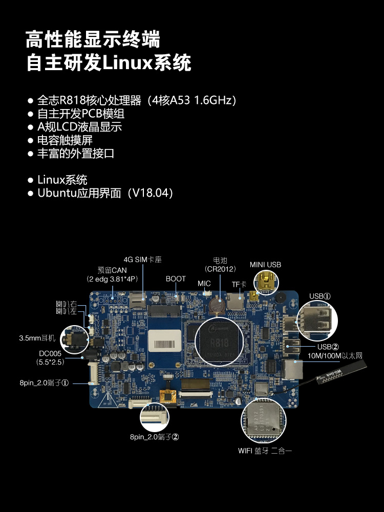 特点描述:XN070LRI01W系列,是j9国际备用基于ARM A53架构自主研发设计的一款工业Linux智能触控显示终端,由底板、LCD显示屏及触摸屏组成。搭载全志R818四核处理器,Ubuntu18.04操作系统,支持自主设计程序安装;全新丽色显示系统,支持自主调节冷暖色调;支持4K视频播放,200万双摄;接口资源丰富,用户可通过 RS232、RS485、CAN等串口端口与外部设备进行通信;也可以通过WIFI/以太网联网、浏览网页、播放音乐、播放视频、远程升级更新等。