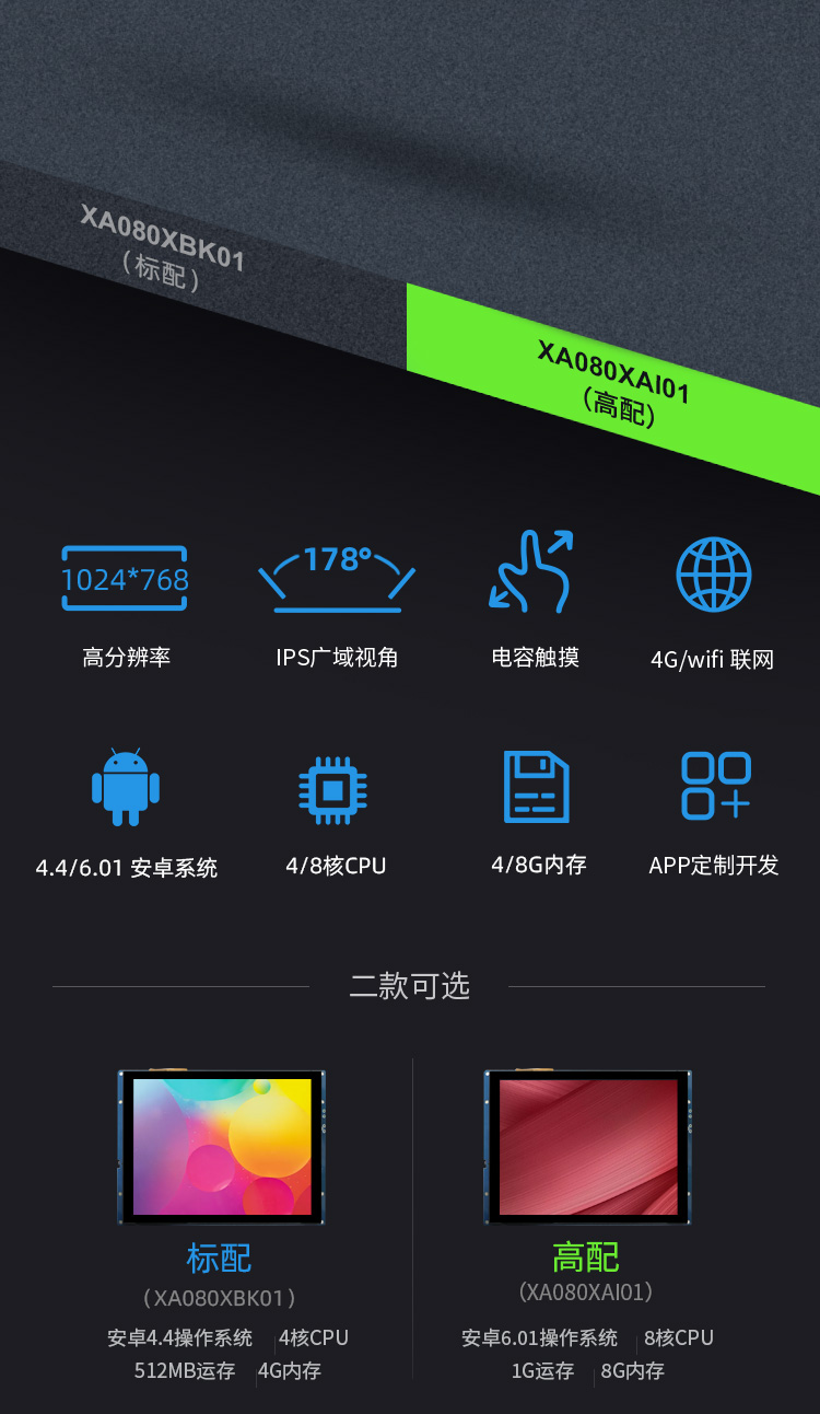 特点描述:XA080系列产品搭载j9国际备用安卓系统,是基于j9国际备用8核A7硬件平台研发的拥有自主知识产权的智能图形显示系统。用户可通过安卓智能显示终端轻松实现触控及显示功能,并通过安卓通用安卓APP实现各种用户个性化需求,如WIFI上网,有线上网,浏览网页,播放音乐,播放视频,数据拷贝等。还可通过RS232,RS485端口与外部设备进行通信。