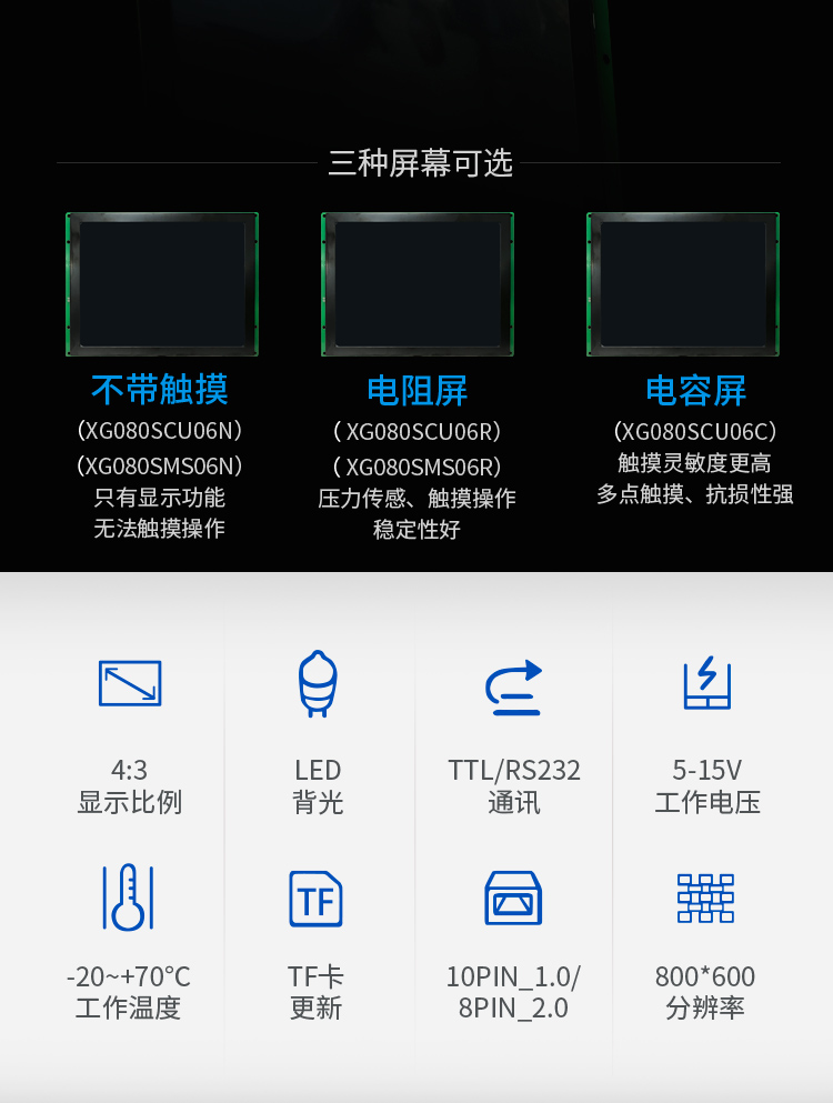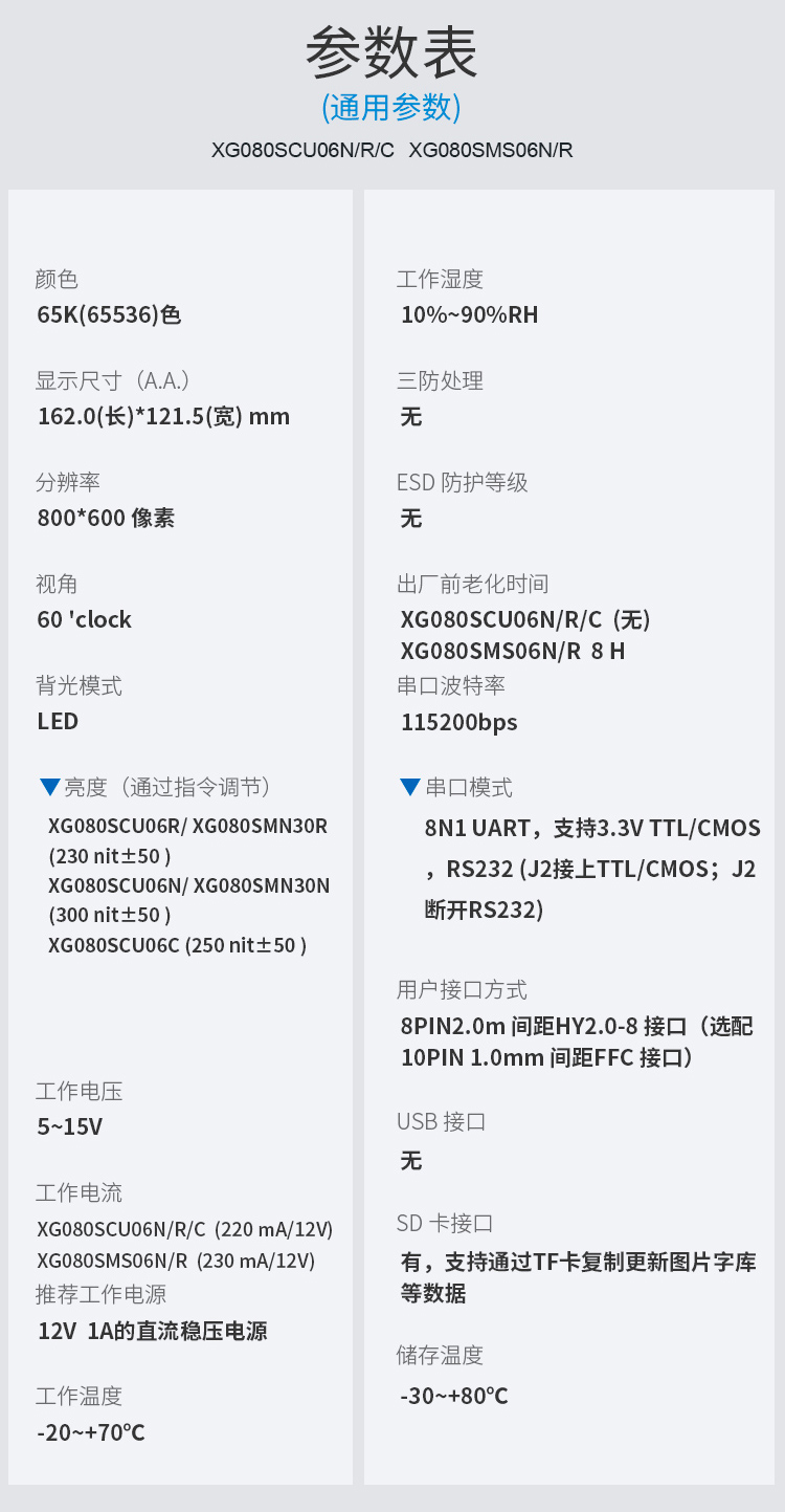特点描述:XG080SMS06系列搭载j9国际备用SGUS(超级图形应用软件)系统,是基于j9国际备用串口屏硬件平台研发的拥有自主知识产权的智能图形显示系统。用户可通过SGUS串口智能显示终端轻松实现触控功能,如数据文本录入、按键值返回、增量调节、弹出菜单等;也可以快速实现显示功能,如表盘时钟、图标变量、艺术字、曲线显示、列表显示、文本显示等。