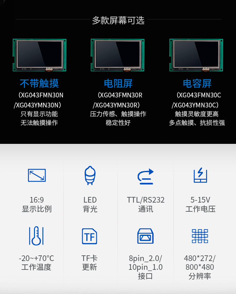 特点描述:XG043系列产品搭载j9国际备用SGUS(超级图形应用软件)系统,是基于j9国际备用串口屏硬件平台研发的拥有自主知识产权的智能图形显示系统。用户可通过SGUS串口智能显示终端轻松实现触控功能,如数据文本录入、按键值返回、增量调节、弹出菜单等;也可以快速实现显示功能,如表盘时钟、图标变量、艺术字、曲线显示、列表显示、文本显示等。